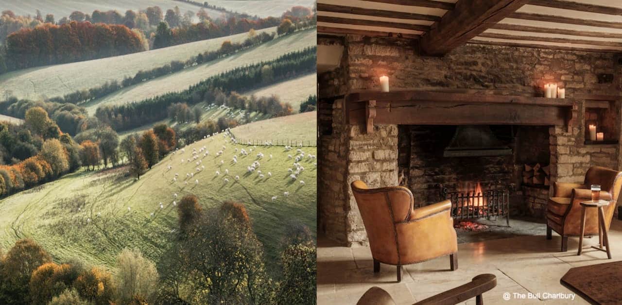 Four more rooms sit atop the historic pub and restaurant with its wooden booths, Chesterfield chairs, and a commanding hearth containing an inglenook fireplace. Here one can sample such local farm-to-table fare as open fire-roasted pigeon with Girolle mushrooms, washed down with a refreshing pint.